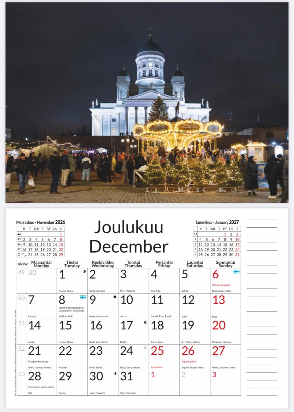 Upeassa vuoden 2026 seinäkalenterissa on 12 kuvaa Helsingin keskeisistä kohteista eri vuodenaikoina.